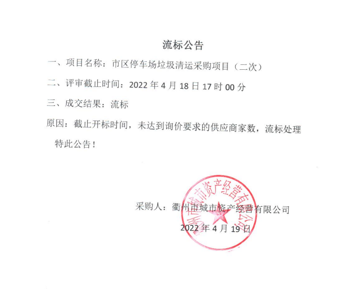 市區(qū)停車場垃圾清運(yùn)采購項(xiàng)目(二次)流標(biāo)公告