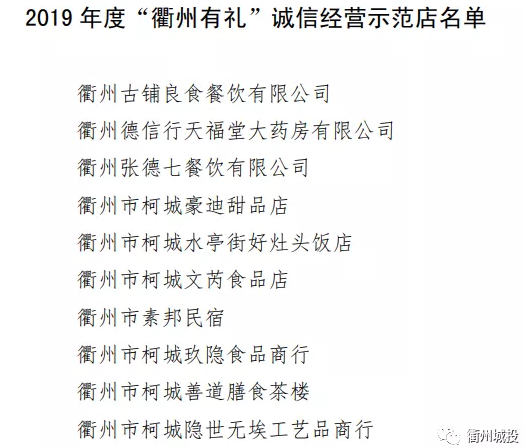 衢州古鋪良食餐飲有限公司、衢州德信行天福堂大藥房有限公司、衢州張德七餐飲有限公司等10家門店獲評“衢州有禮”誠信經(jīng)營承諾示范店。