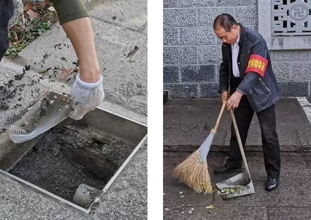 ▲清理街區(qū)下水道煙頭、清掃路面垃圾
