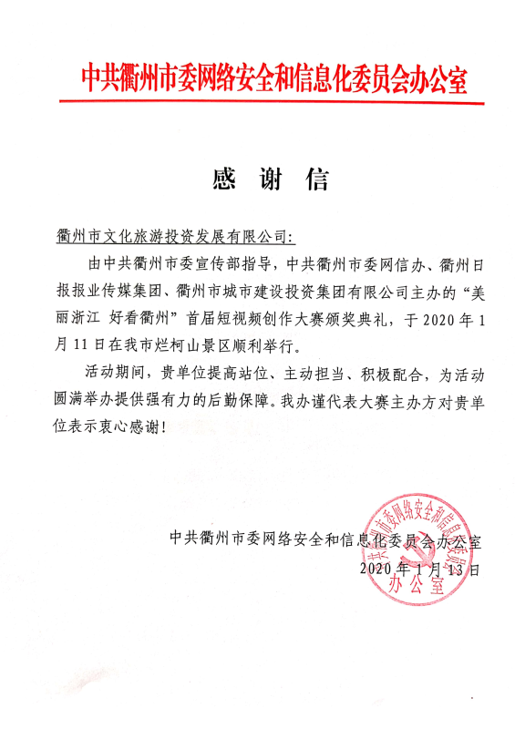 中共衢州市委網(wǎng)絡安全和信息化委員會辦公室向文旅投公司發(fā)來感謝信
