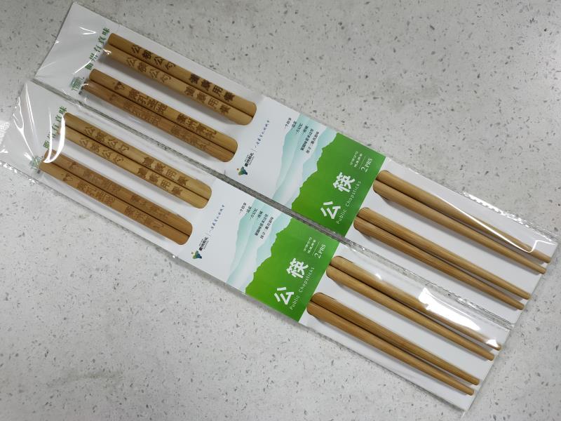 公筷長30cm,材質(zhì)以雞翅木和毛竹為主,公筷粗端還雕刻印制了“衢州有禮”品牌logo和“公筷公勺 健康用餐”字樣。